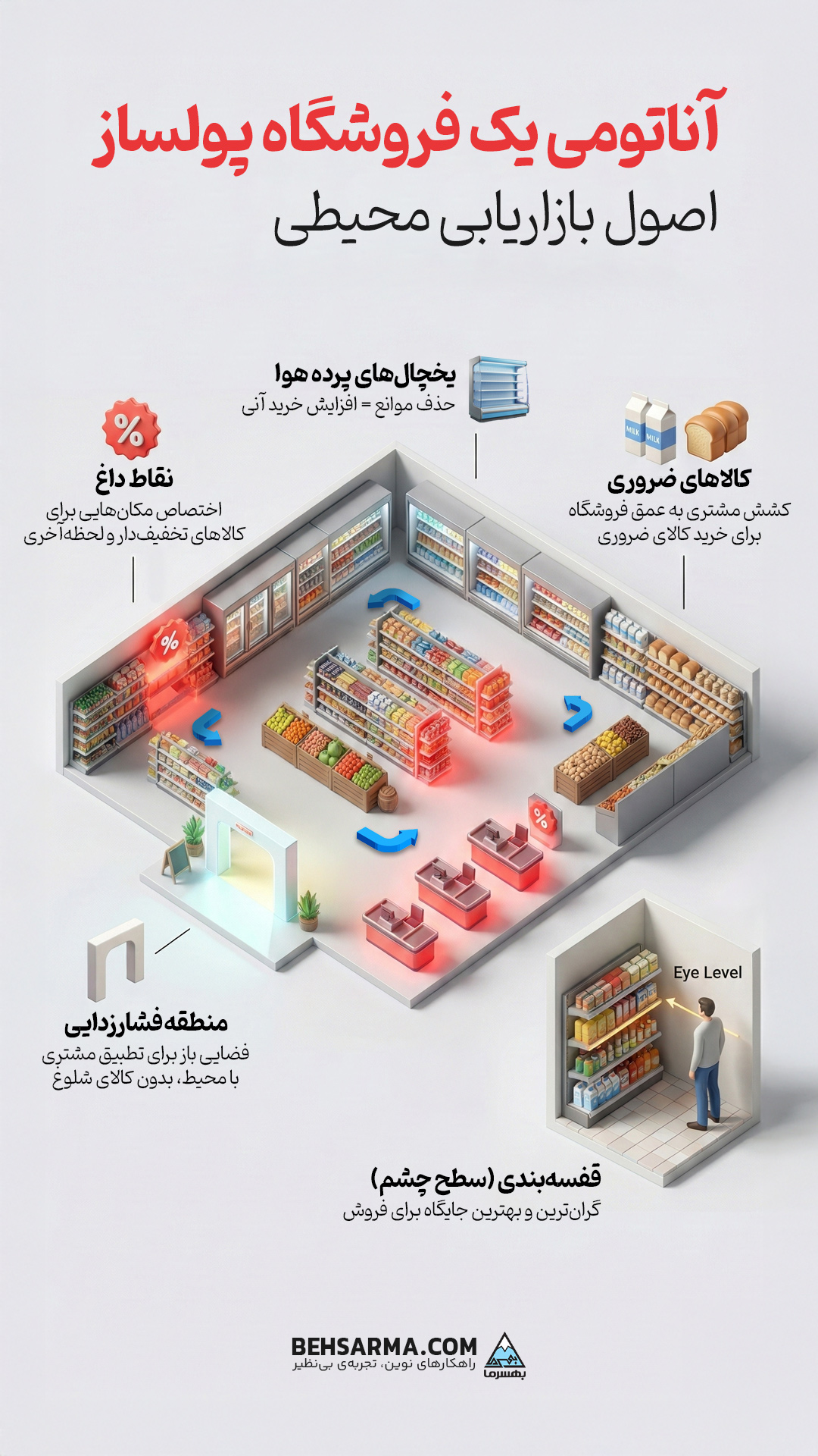 سطح چشم (Eye Level): این منطقه طلایی فروشگاه شماست. محصولاتی که در ارتفاع چشم (حدود ۱۱۰ تا ۱۶۰ سانتیمتر) قرار میگیرند، بیشترین فروش را دارند. برندهای بزرگ معمولاً برای قرار گرفتن در این طبقات هزینههای سنگینی میپردازند.